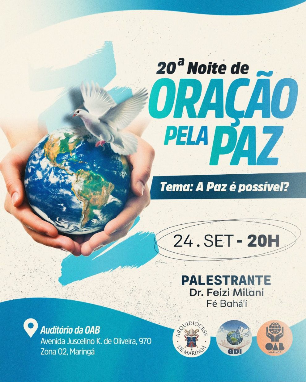 O Grupo de Diálogo Inter-religioso (GDI) de Maringá convida a comunidade para a 20ª Noite de Oração pela Paz, um evento inter-religioso que celebra a união entre diferentes crenças em prol da paz e da não-violência. O evento será realizado no dia 24 de setembro de 2025, às 20h, no Auditório da Ordem dos Advogados do Brasil (OAB) – Subseção de Maringá.
