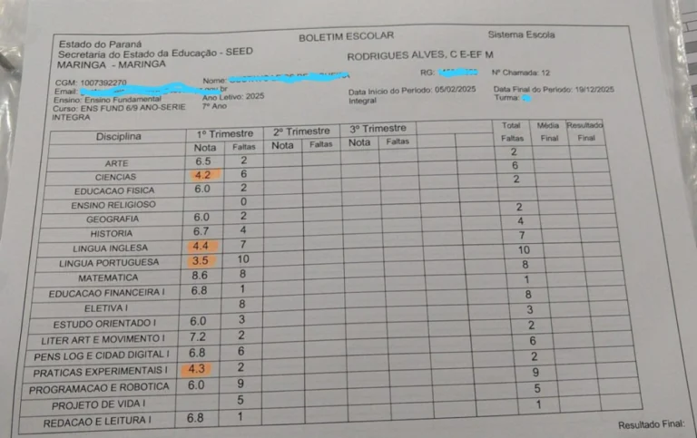 No entanto, ao acessar o aplicativo Escola Paraná, ela afirma ter identificado que a nota do primeiro trimestre havia sido alterada para 6,0, o que garantiu a aprovação do estudante. Ainda conforme o sistema, o aluno passou a constar com notas 60 no primeiro e segundo trimestres e 75 no terceiro. A mãe disse possuir registros das informações e relatou estranhamento com a mudança.